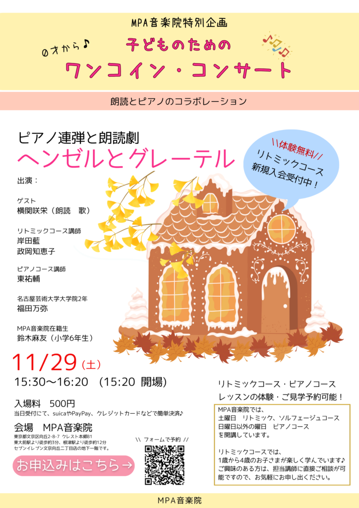 出演:横関咲栄(ゲスト 朗読・歌) 岸田藍 政岡知恵子(リトミックコース講師) 東祐輔(ピアノコース講師) 福田万弥(名古屋芸術大学大学院2年) 鈴木麻友(MPA音楽院在籍生・小学6年生)